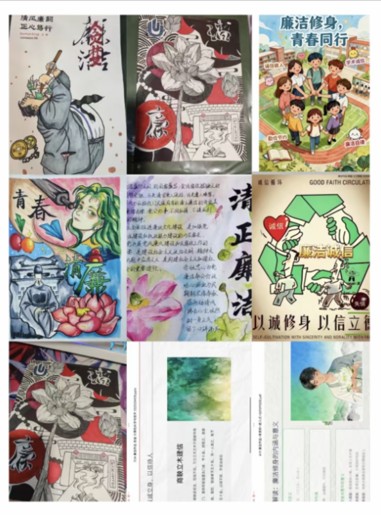 活动自启动以来,得到学院师生的积极响应与广泛参与。参赛作品紧密围绕“廉洁修身,青春同行”主题,聚焦诚信立人、勤俭节约、廉洁自律等维度,以漫画、海报、PPT等多种形式展开创作。师生们以独特的艺术视角和丰富的表现手法,生动阐释了对廉洁文化的深刻理解与自觉践行。活动共征集各类作品100余件,内容主题鲜明、形式载体多样,既体现了师生对廉洁理念的个性化思考,又紧密结合校园学习生活实际,充分展现了师生崇廉尚洁、积极向上的精神风貌,进一步激发了全院师生的创作热情与参与意识,营造了浓厚的廉洁文化育人氛围。