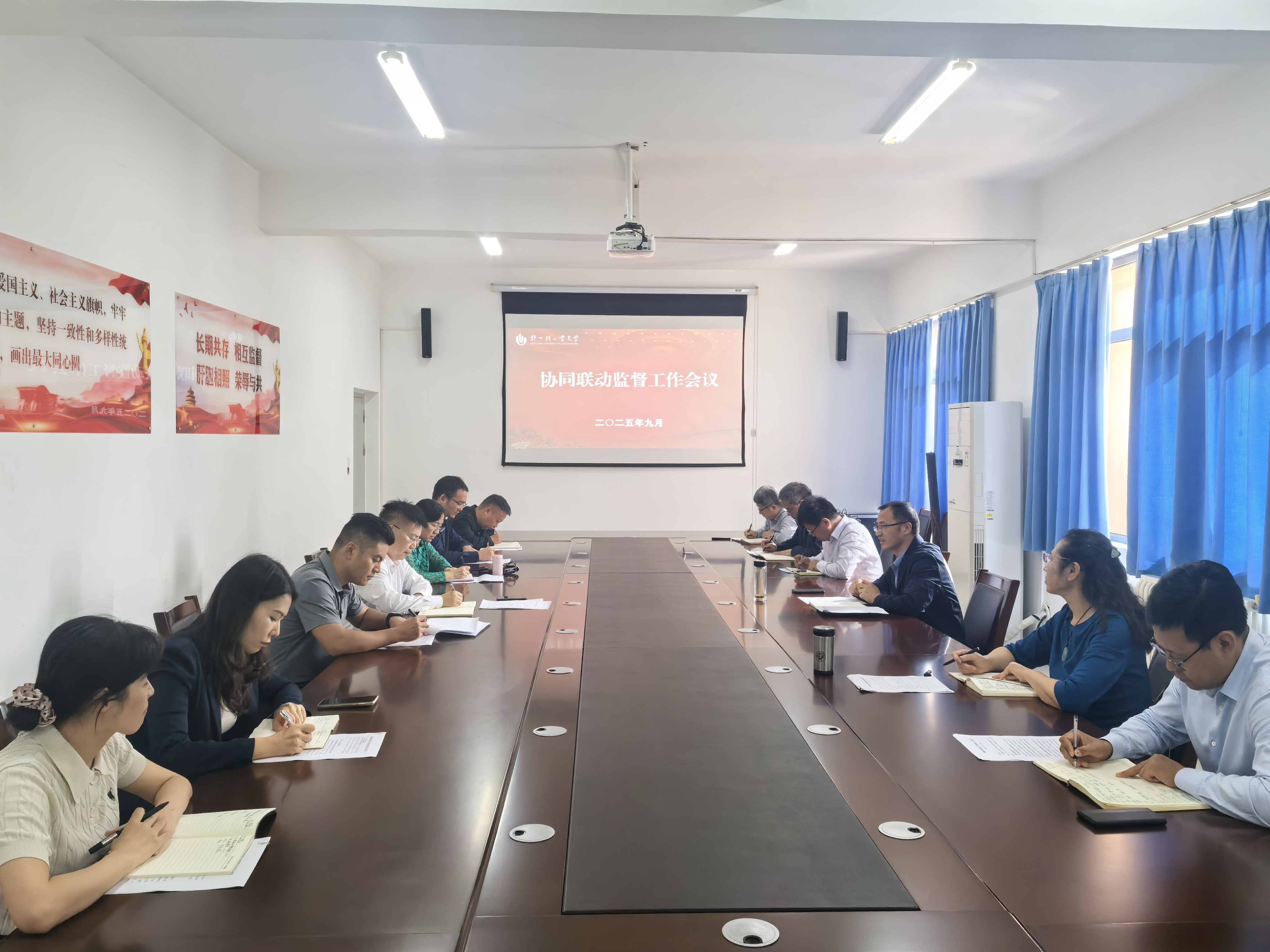 为深入研判2025年学校政治生态,落实学校协同联动监督机制和党委纪委会商工作机制,深入推进“两个责任”贯通衔接、协同落实,凝聚工作合力,9月29日,学校协同联动监督工作联席会议在科学校区办公楼419会议室召开。纪委书记、监察专员顾兴良出席并主持会议。学校党委办公室、组织部、宣传部、统战部、巡察办,纪委,校长办公室,人事处,财务处,审计处等协同联动监督成员单位参加会议。